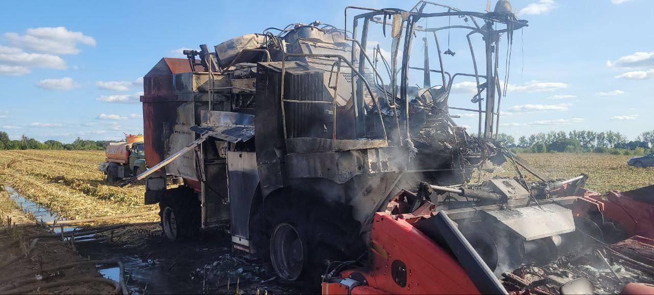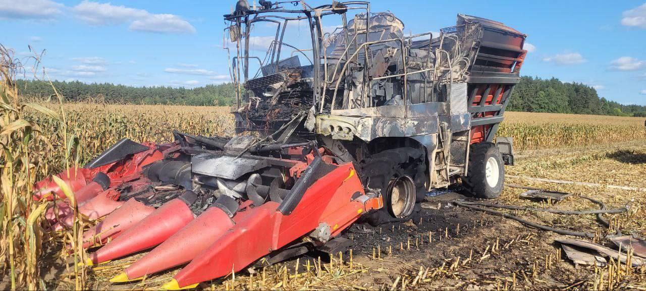 Сообщается, что кукурузоуборочный комбайн состоит на балансе ПО «Кукурузокалибровочный завод» ГП «Брест-травы». Огнем уничтожен моторный отсек, кабина, две покрышки передних колес, поврежден измельчающий аппарат (жатка), лакокрасочное покрытие кузова.