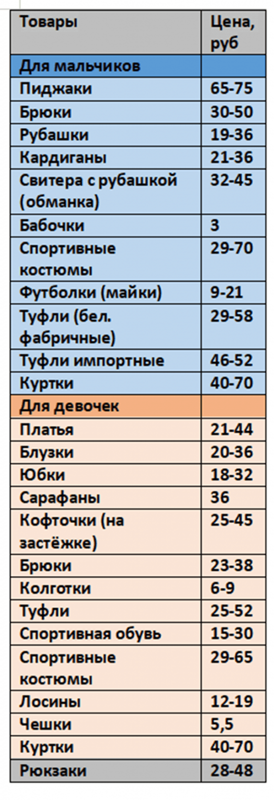 Спортивные костюмы можно приобрести по цене от 29 до 65 рублей. Естественно, наряды для младших школьников дешевле, чем для старшеклассников.