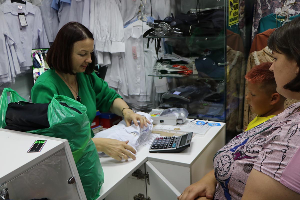 В выходные 30 июля в магазине было очень многолюдно. Родители подбирали в школу нарядную и спортивную одежду и обувь.