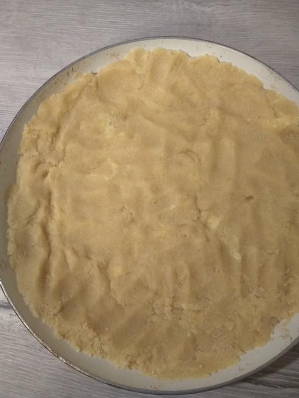 Тесто выложить в форму, формируя при этом бортики. Поставить форму с тестом в холодильник на 15-20 минут.