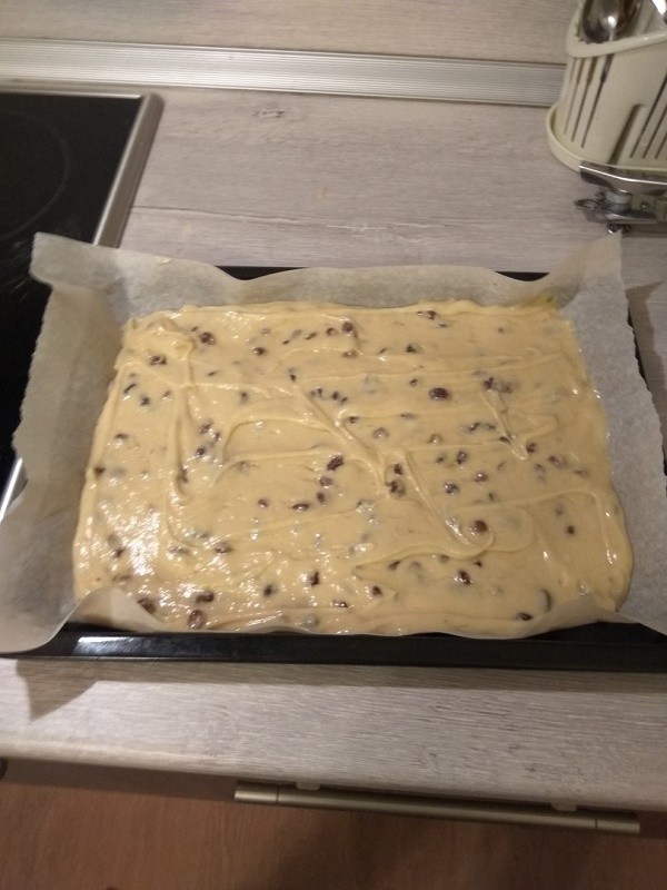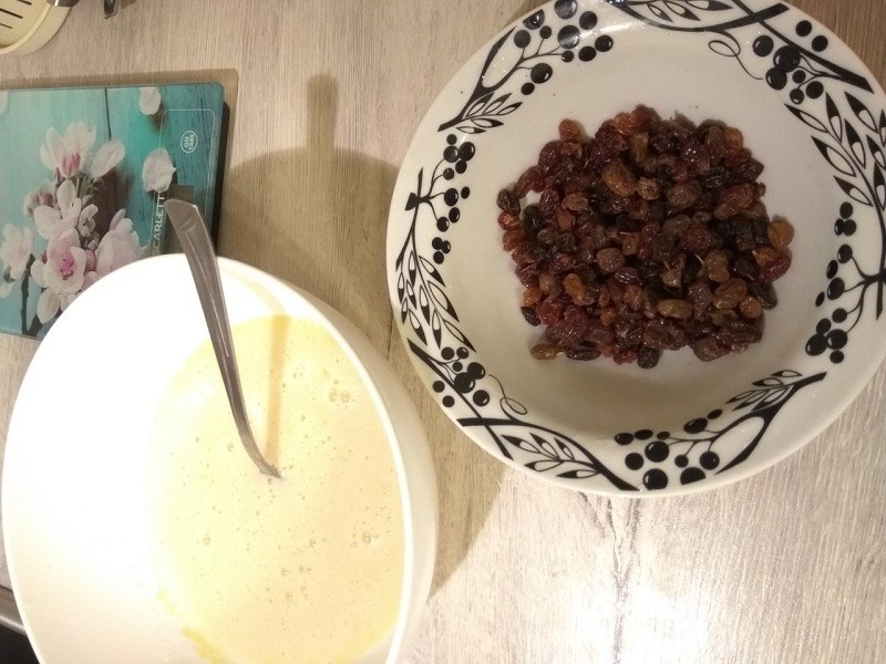 Чернослив ошпариваем кипятком и нарезаем дольками, добавляем к массе. Я заменила чернослив изюмом, предварительно замочив в воде, чтобы он разбух.
