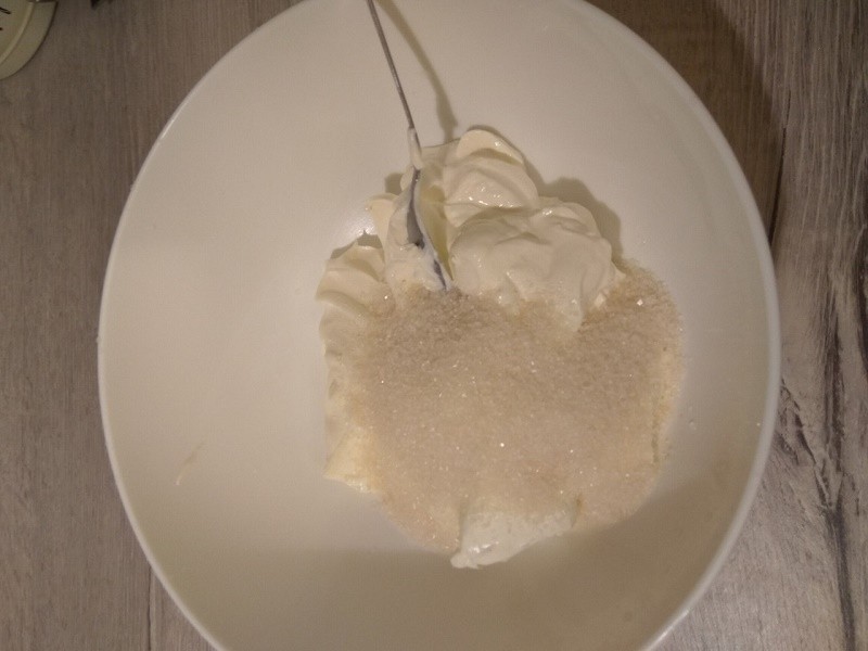 Готовим крем для торта: взбиваем миксером сметану с сахаром и ванилином.
