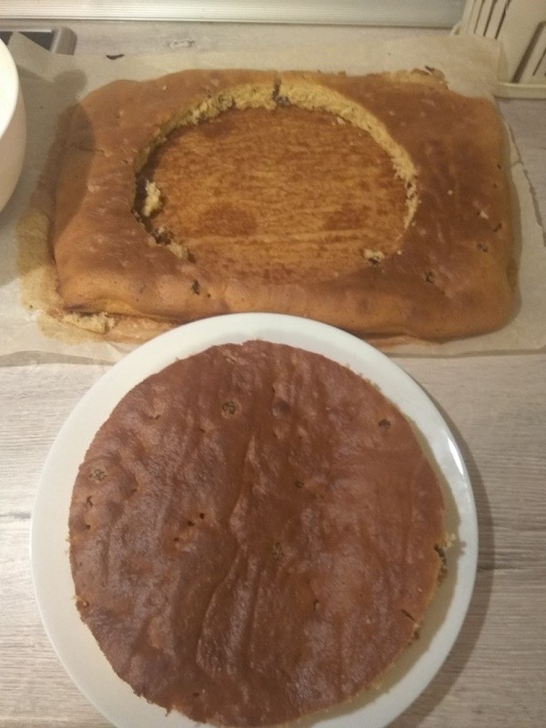 Из бисквита вырезаем основание — 1-й слой тортика.
