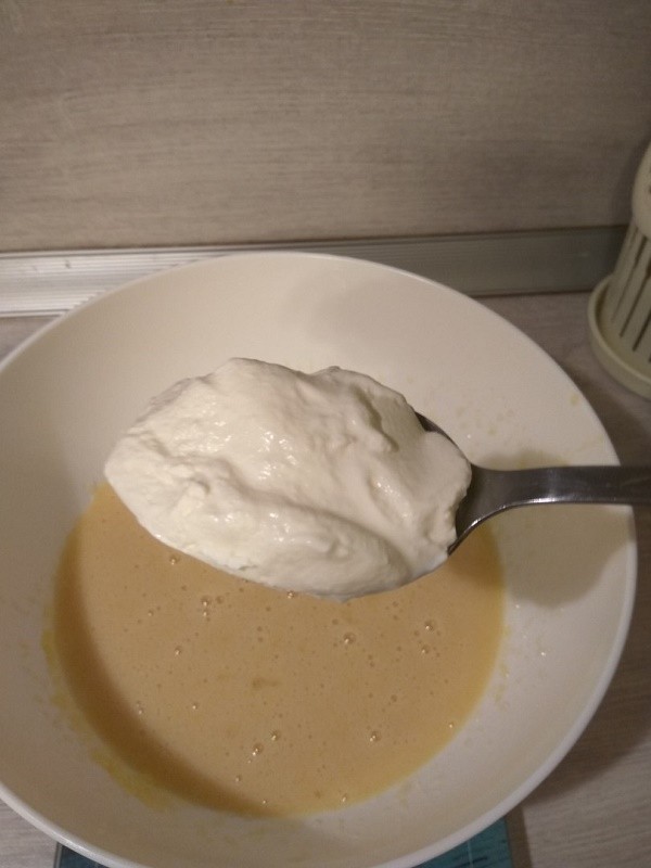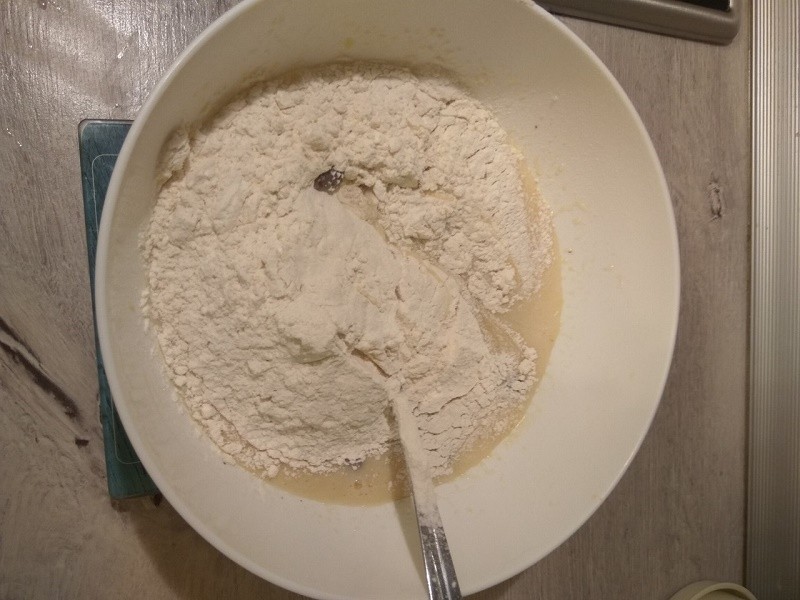 Небольшими порциями всыпаем муку, перемешиваем в однородную массу, напоминающую сметану.
