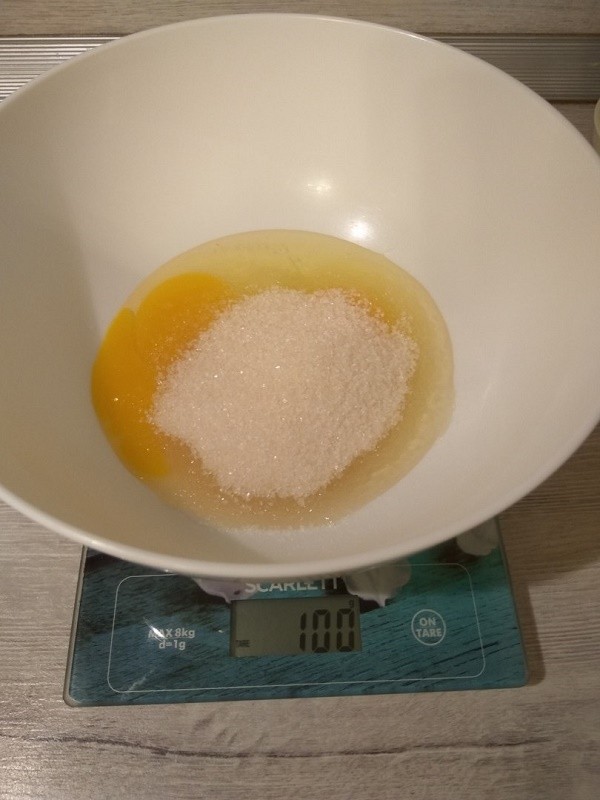 Разбиваем в миску два яйца и добавляем 200 грамм сахара.