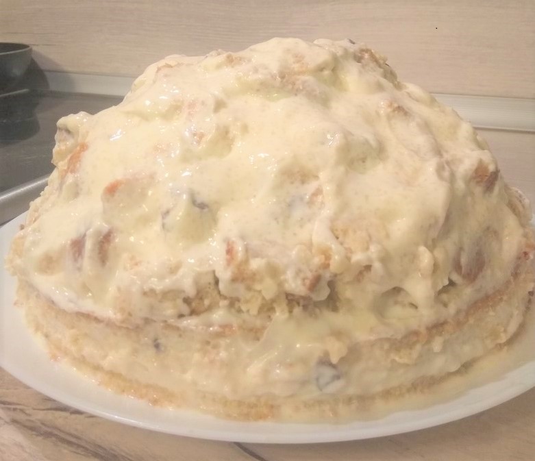 Заливаем все промежутки сметанным кремом. Ставим для пропитки в холодильник на 2 часа минимум.