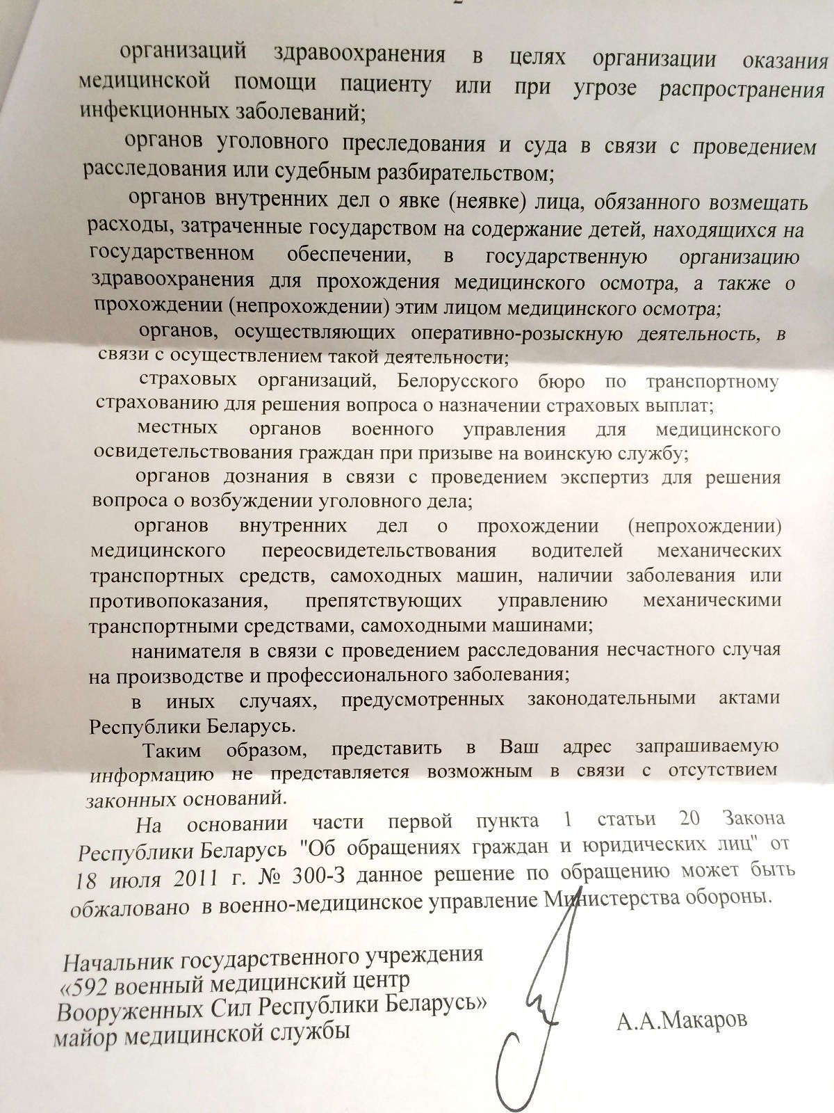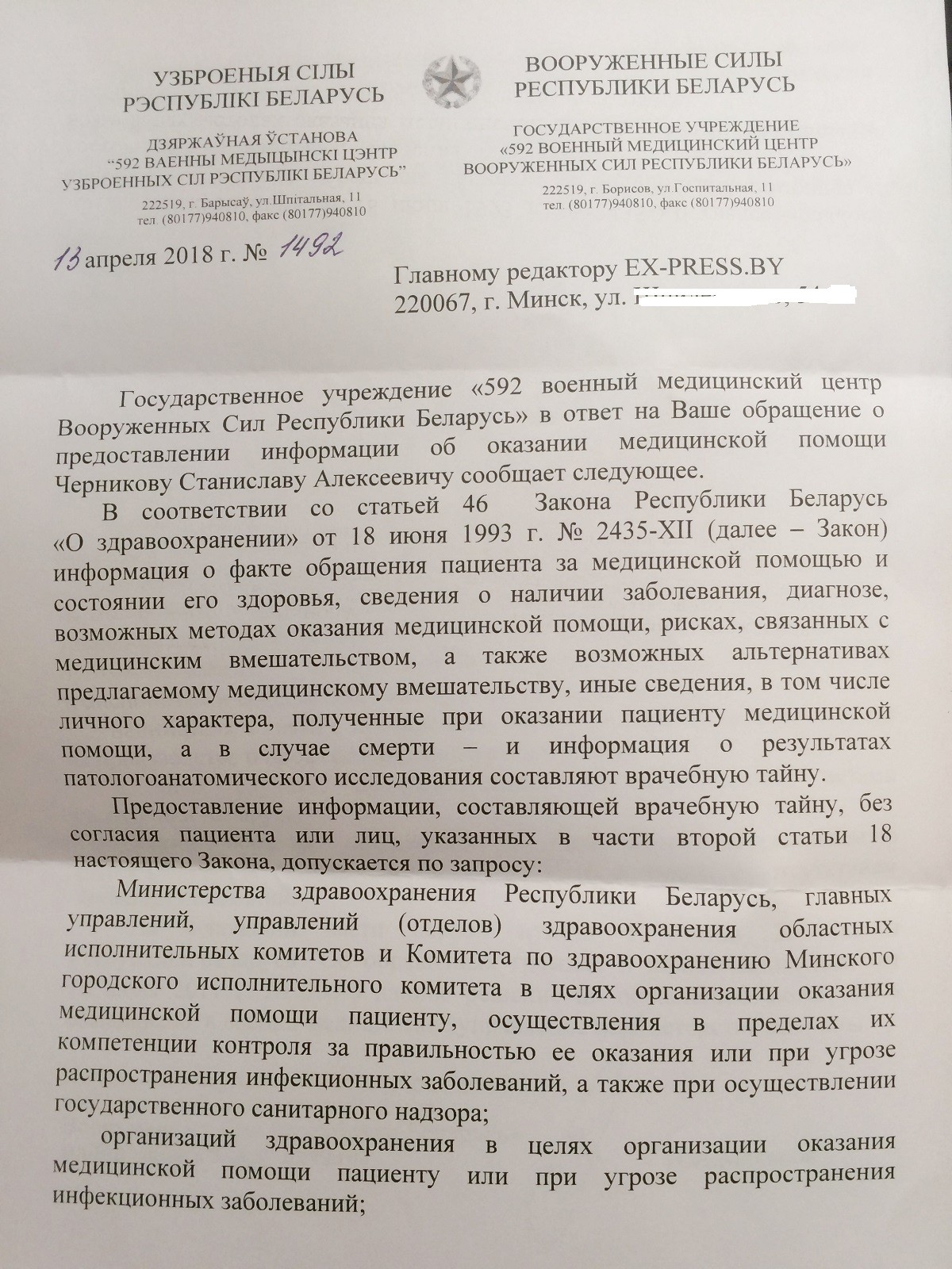 Коллеги с борисовского сайта также заинтересовались этой темой. На их запрос был получен ответ от 13 апреля 2018 г. № 1492 с ГУ «592 военный медицинский центр Вооруженных Сил Республики Беларусь», в котором со ссылкой на статьи 18 и 46 Закона Республики Беларусь «О здравоохранении», в итоге написано: «представить запрашиваемую информацию не представляется возможным в связи с отсутствием законных оснований».