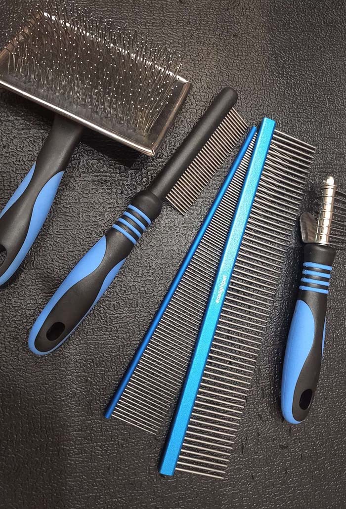 С помощью специального инструмента я снимаю весь линяющий слой шерсти. Если необходимо, использую колтунорез, расчёску по грязной шерсти, по густой шерсти, по чистой шерсти, силиконовую щётку и другие инструменты.